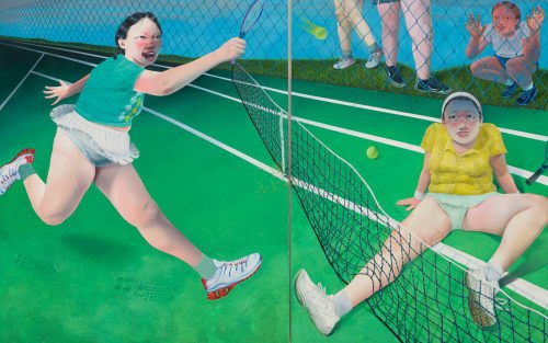 Some of the most compelling contemporary renderings of sport include the non-organized, non-traditional variety. We’re Up Next, a 2023 painted paper collage by Melvin Nesbitt Jr., depicts a pick-up basketball game in a public housing community like the one Nesbitt grew up in. The artist has said he seeks to capture the joy of Black childhood, and his scenes of kids playing, dancing, and throwing around a ball do just that. In slightly more adult scenarios, Puerto Rican artist Jean-Pierre Villafañe (who has a solo show at Charles Moffett, New York, through August 2) similarly finds joy in his ecstatic paintings of libertine figures. His 2023 painting Permanent Vacation depicts five beachgoers in various states of undress, tapping a beach ball, carrying a tray of cocktails, and otherwise posing with their long, toned legs extended. Villafañe’s work, whether set in an office, a dance hall, or the great outdoors, gets at a different kind of physical effort beyond the bright lights of an arena.