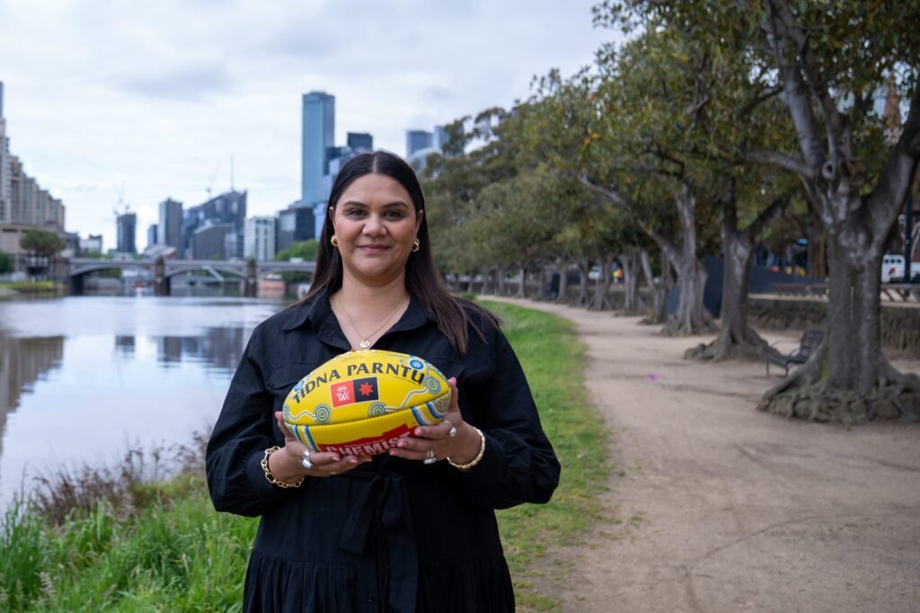 Kaurna artist Gabriel Stengle’s interpretation of the journey of the AFLW community has taken the form of a Sherrin and her design will be on the balls during this weekend’s Indigenous Round, and continuing next weekend.