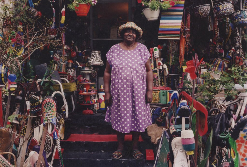 She began turning the house into an artwork in 1975, using found materials such as old Easter baskets, hubcaps, and discarded shoes to build assemblages in the yard. Boldly painted with her signature dots, Hull’s designs eventually began attracting visitors from around the world.