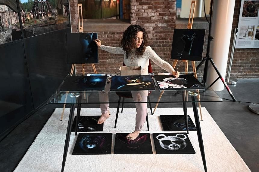 VLAARDINGEN, Netherlands – With a look of fierce concentration on her face, Dutch artist Rajacenna van Dam is crafting 10 paintings at the same time. She is wielding four paintbrushes simultaneously – one in each hand, and one held by the toes of each foot.